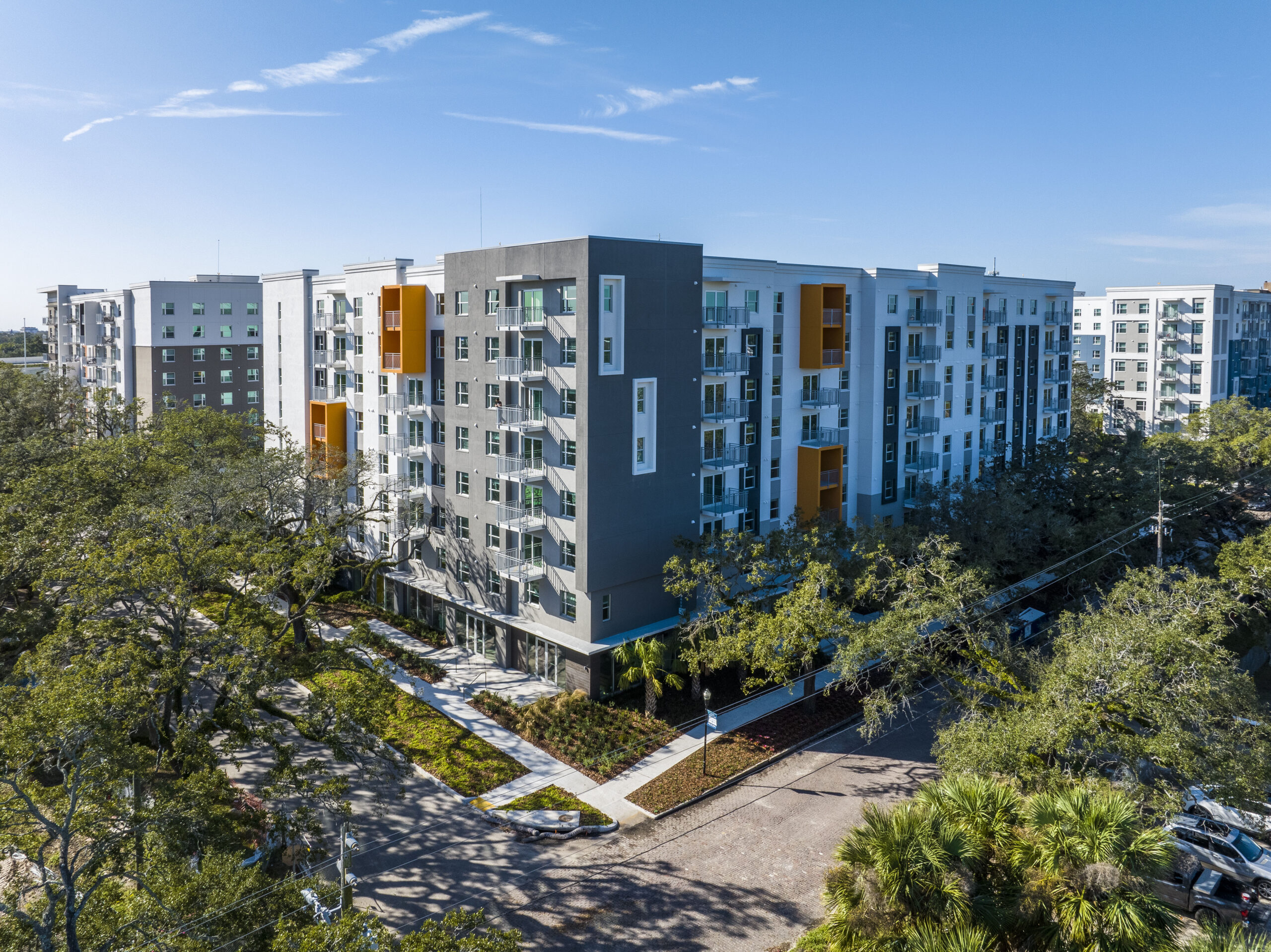 New mixed-use development, 194,000-SF total, offering commercial space and 136 residential units in the West River neighborhood adjacent to downtown Tampa. Resident amenities include a community center, library and fitness center. This project also features a new 500’-long greenway park connecting multiple buildings the residential development. The 1.5 acres park includes: decorative pavers and lighting, a monumental sculpture, custom landscape and hardscape features, stage and trellis area and walking paths.