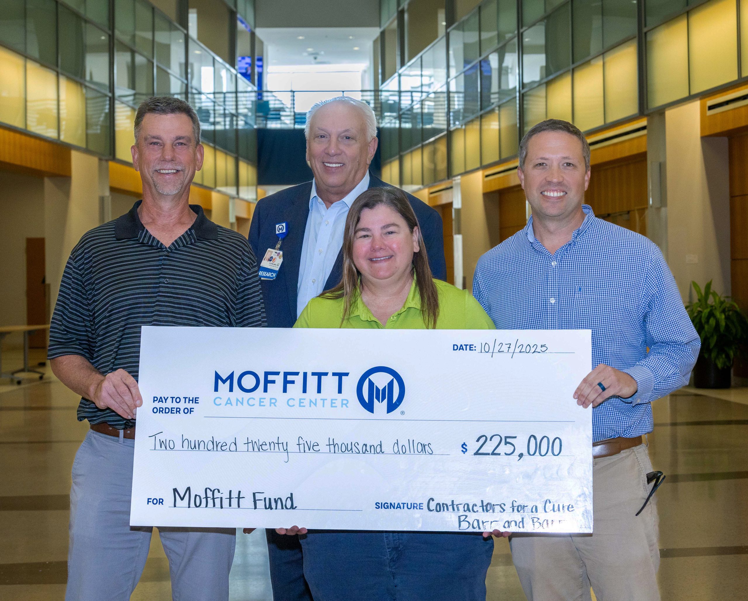 Last week, our team presented the Moffitt Cancer Center Foundation with a check for $225,000 – representing funds raised from our Annual “Contractors for a