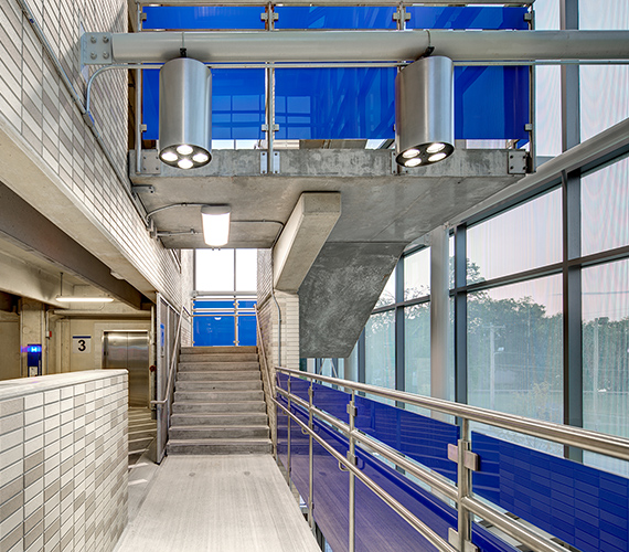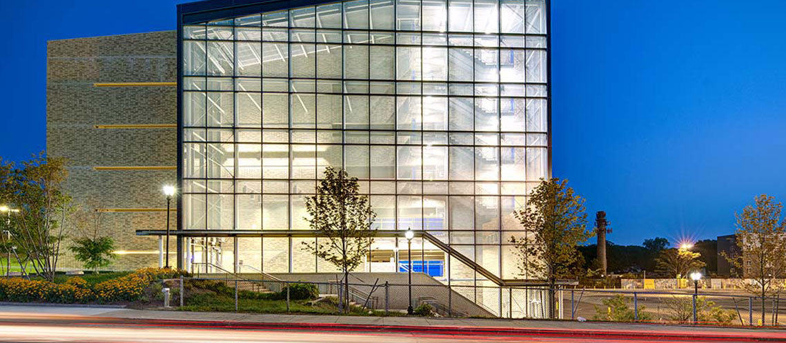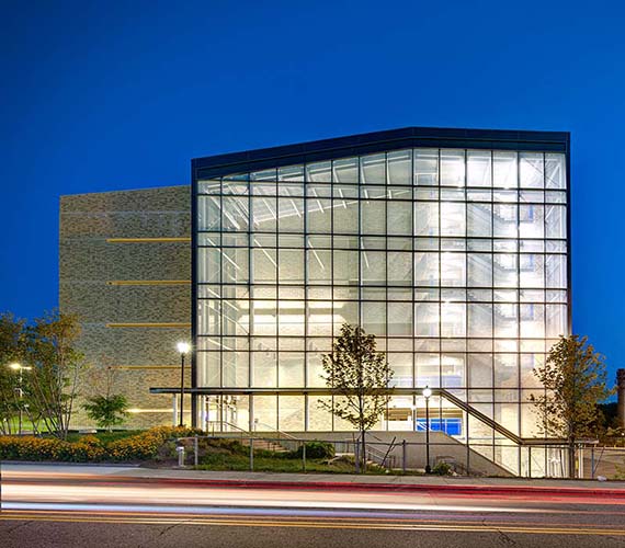The South Campus Parking Garage features a five-story precast concrete open-air parking facility built on the existing Riverview surface parking lot. The structure accommodates 762 passenger vehicles and houses equipment storage, mechanical space, stair and elevator towers, a glass-enclosed lobby and a full security system featuring CCTV cameras, call assistance stations and vehicle and pedestrian card access systems.